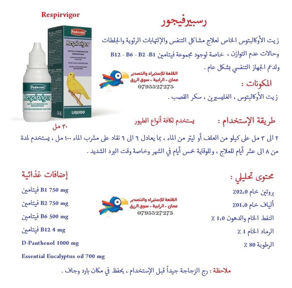 طعام سائل يستخدم الخصائص البلسمية والمحللة للبلغم لزيت الأوكالبتوس الأساسي للتركيبة لدعم وظيفة الجهاز التنفسي في الطيور في الأقفاص والطيور.