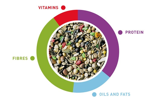 Vitaminized mixture of traditional seeds and grains for birds, enriched with vegetable seeds and crumbled biscuits.