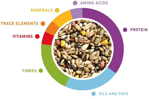 Feed formulated in cooperation with university researchers, comprising a blend of seeds and other select natural ingredients, integrated with extruded ProBalance granules (6%) that provide the micronutrients that are essential for a correct diet
